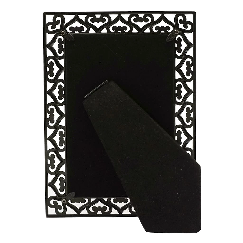 Stylish hearts and sparkly rhinestones beautifully accent this pierced, diecast metal frame. It’s perfect for displaying a wedding photo or other romantic picture.