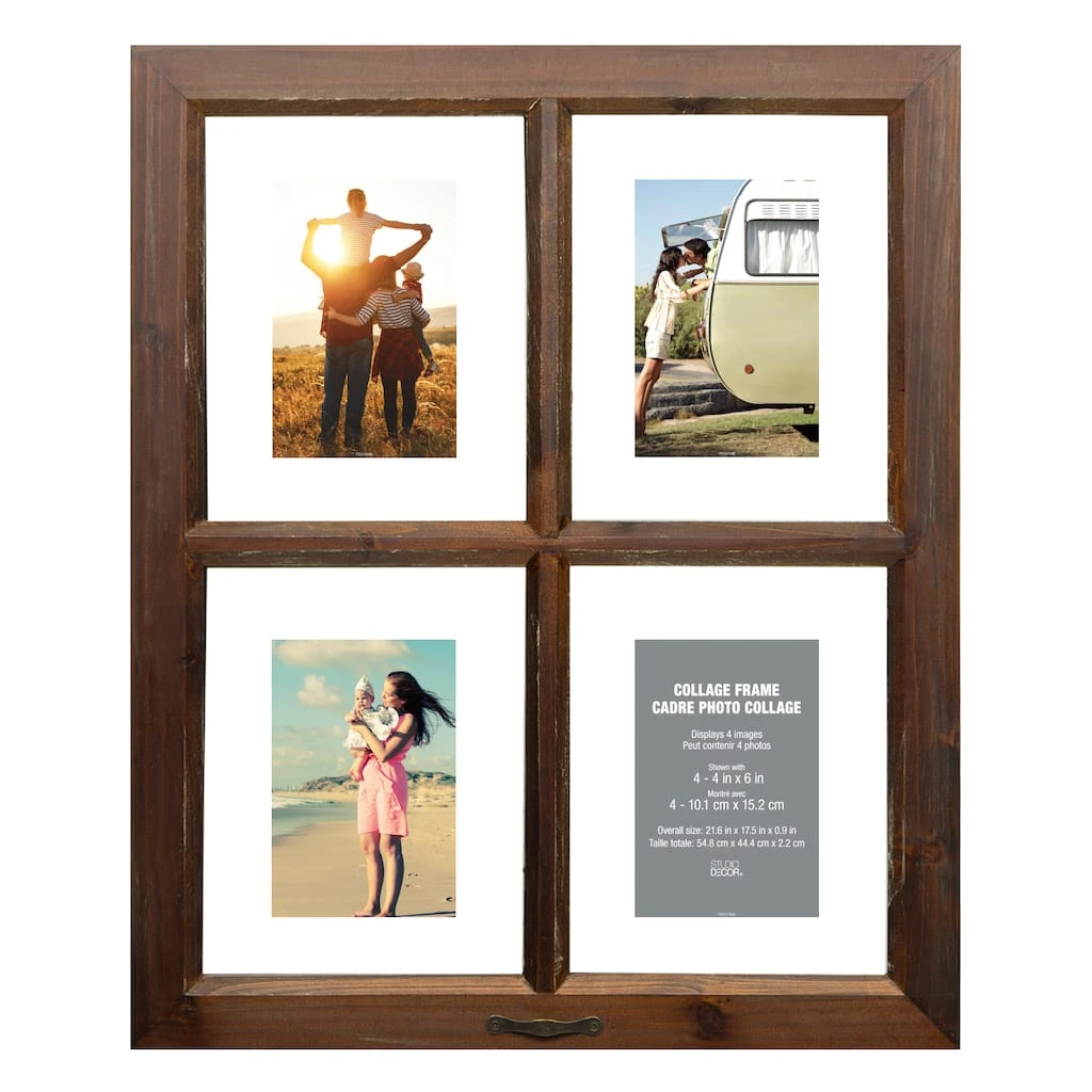 This charming collage frame looks like a vintage window with four panes! This frame has four cutouts, so you can display related photos in each pane to create a lovely photo collage. The decorative hardware at the bottom looks like a brass pull.